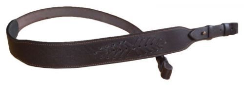 Handmade rifle gun sling made from dark brown natural leather. It has a unique conical shaped design and weaved ornament. Adjustable length using Chicago bolt and microporous padding makes it very comfortable and non-slippery. Impregnated sides (using wax and paint) protects leather from moisture.